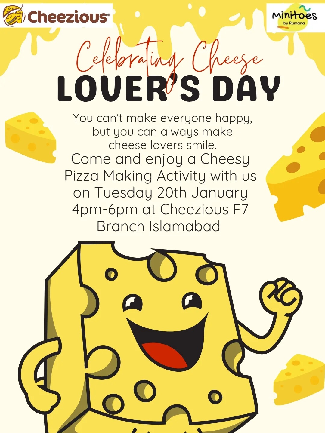 MiniToes is all set to celebrate Cheesy Lover’s Day with an experience that’s extra cheesy and extra fun! Join us for a day packed with cheese, creativity, and smiles—because everything is better with cheese!