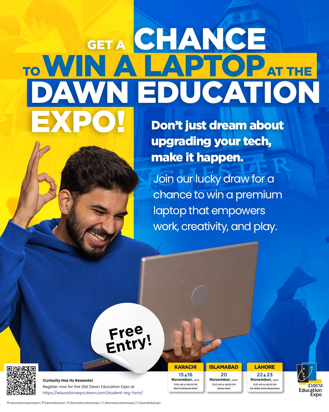 Study abroad dreams + a brand-new laptop? Join the 21st Dawn Education Expo 2025 and enter our Lucky Draw – happening separately in Karachi, Islamabad, and Lahore! Who knows… you might walk out with more than just inspiration.