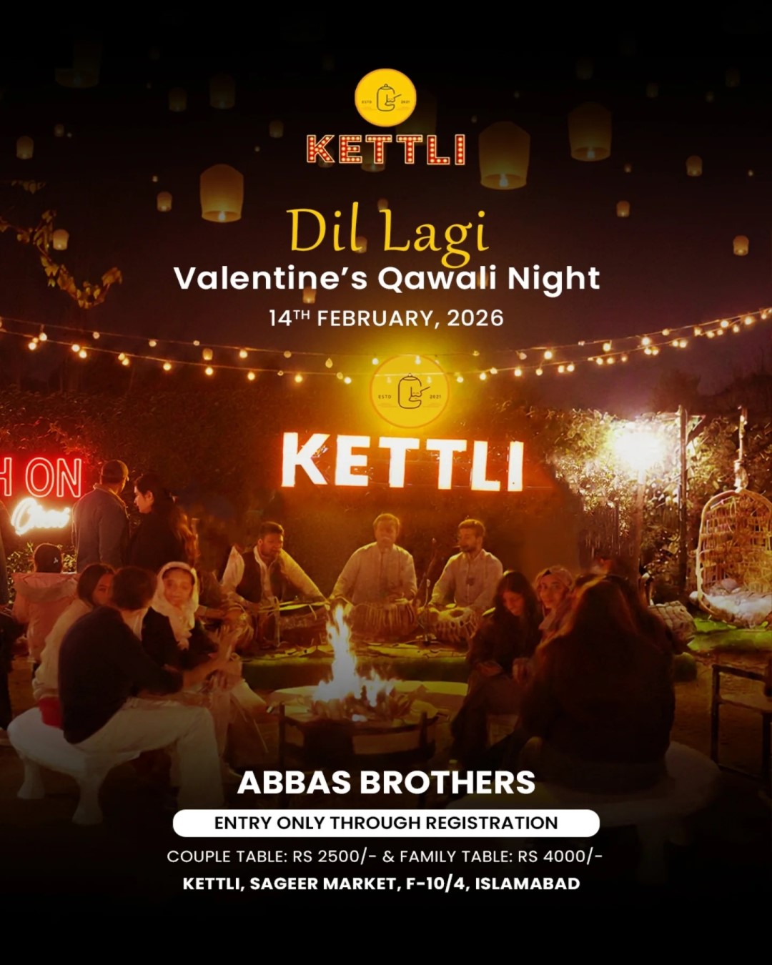 Lanterns in the sky, fire in the mehfil, and soul-touching live Qawali by Abbas Brothers. This 14th February, let love be felt, not said. Presenting Qawali Night asking with lanterns show!