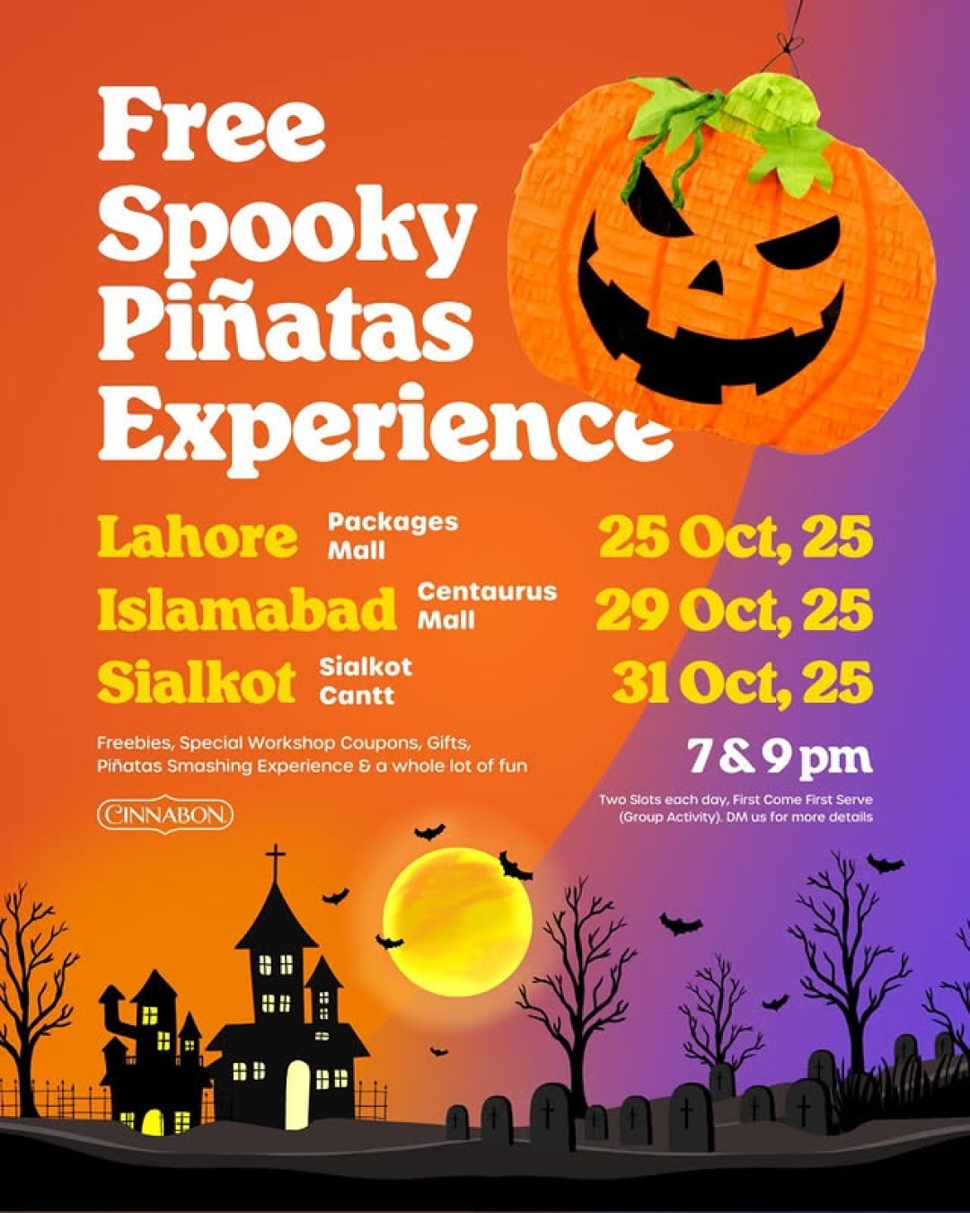Ready for a spooky-sweet surprise? This spooky season, we’re bringing you the Free Spooky Piñatas Experience! A fun-filled celebration where every piñata hides a sweet surprise. Discover Cinnabon gifts, exclusive workshop coupons, and special treats that’ll make your night a little more magical (and a lot more delicious).