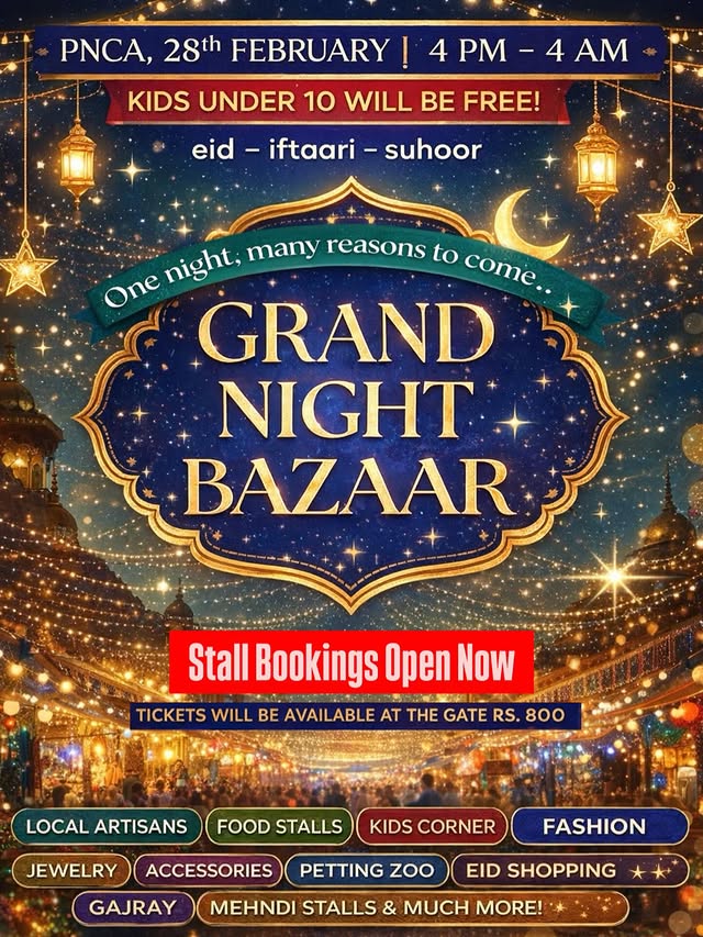 Join us at the Grand Night Bazaar for Eid shopping — all under one roof. Lanterns glowing, stalls buzzing, flavors unforgettable. Don’t miss the most magical night of the season.