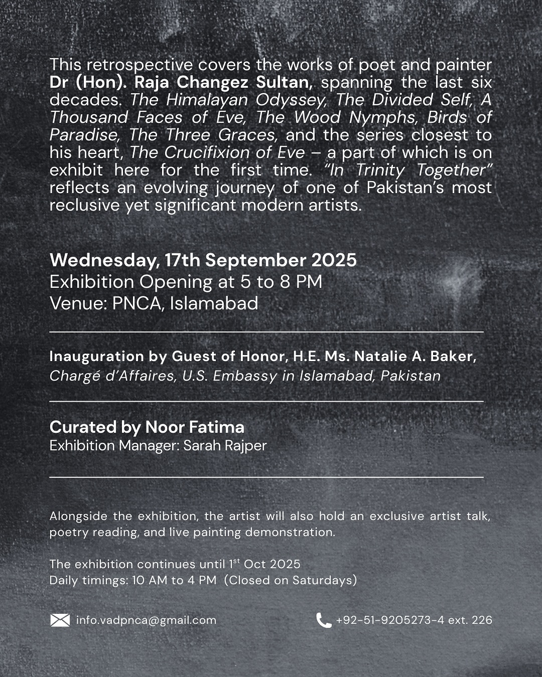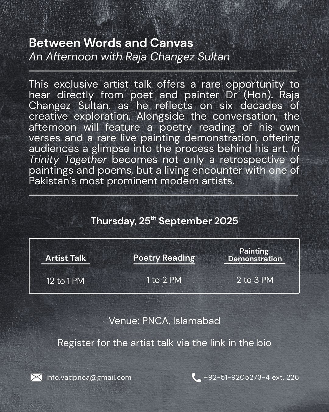 A landmark retrospective of Dr. (Hon) Raja Changez Sultan, one of Pakistan’s most celebrated modern artists. The exhibition spans six decades of Sultan’s practice as both poet and painter. @rajachangezsultan
