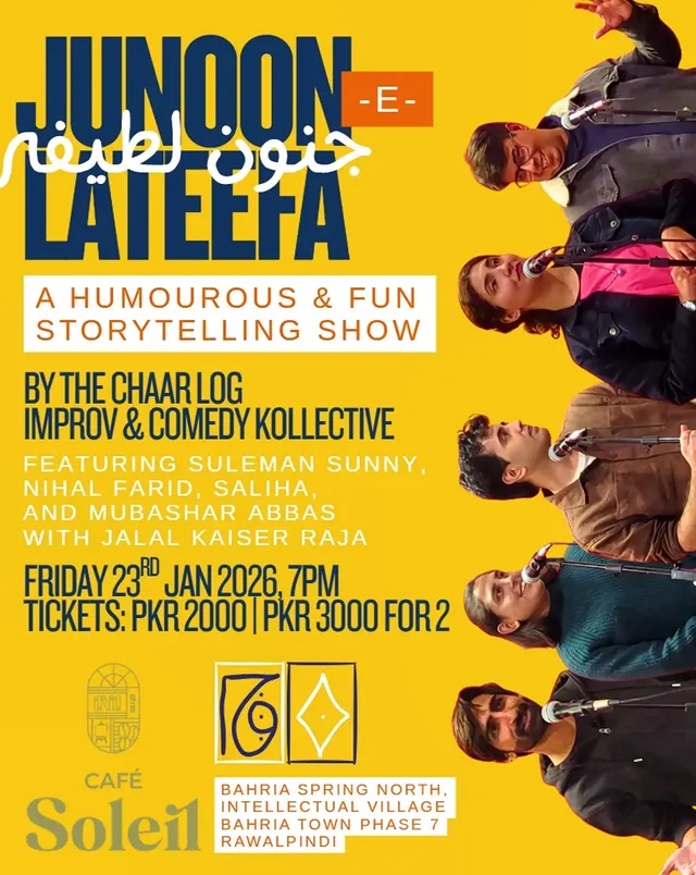 A funny and family-friendly night helmed by Jalal Kaiser Raja promises two hours of entertainment by seasoned artists Mubashar Abbas, Nihal Farid, Suleman Sunny, and Saliha.