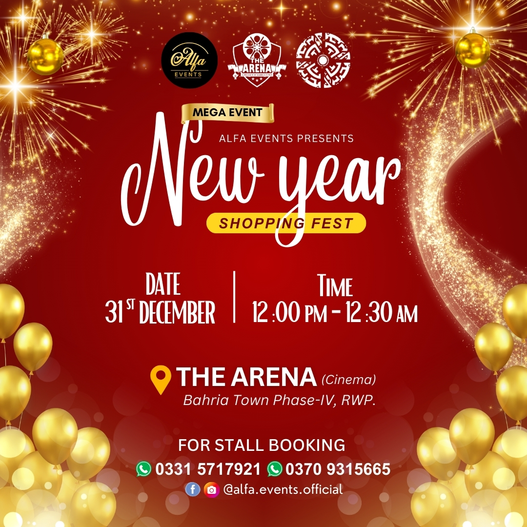 Join us on 31st December at The Arena, Bahria Town Phase 4, and shop from amazing fashion, jewellery, décor, winter wear, accessories, beauty products, food stalls & so much more… all in one grand festive setup! Bring your family, enjoy the New Year spirit, take beautiful photos, shop your favourites, and welcome 2026 with joy!