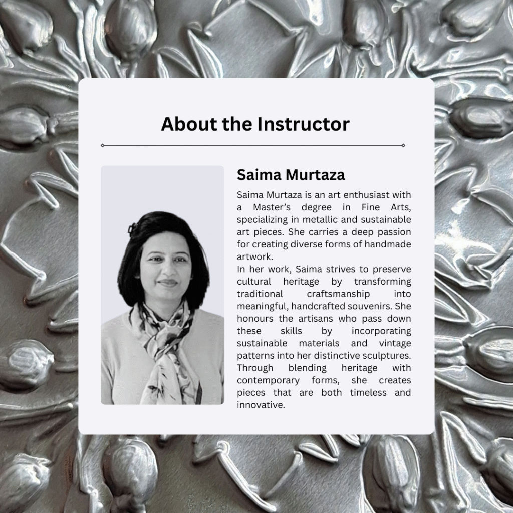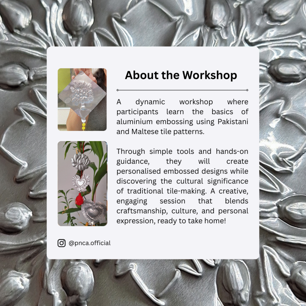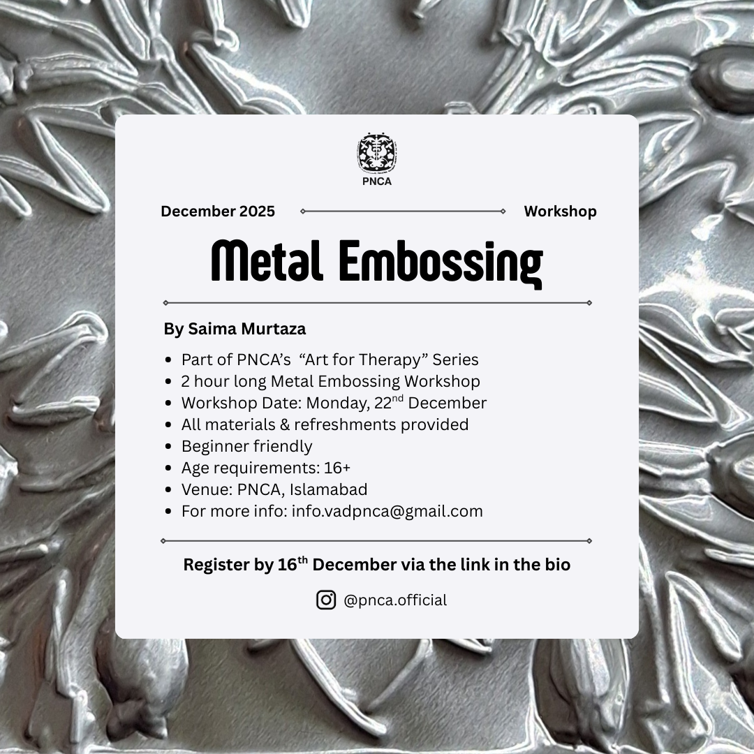 Join us at the Pakistan National Council of the Arts for an engaging, hands-on Metal Embossing Workshop with Saima Murtaza (@sam__murtaza @enigmascreation) as part of PNCA’s Art for Therapy series!