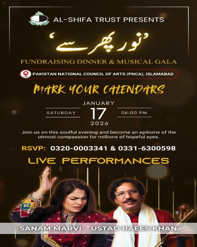 Join us on a philanthropic evening of giving, filled with soulful musical performances and an exquisite dinner at the Pakistan National Council of Arts (PNCA), Islamabad on January 17th, 2026.