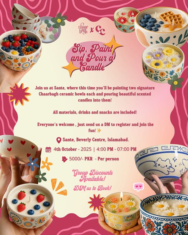 This time at Sante, we’re getting even more creative, you’ll be painting two signature Chaarbagh ceramic bowls and pouring your own beautiful scented candles into them!