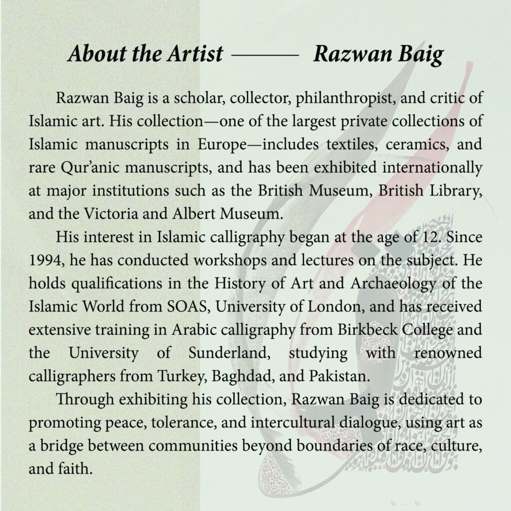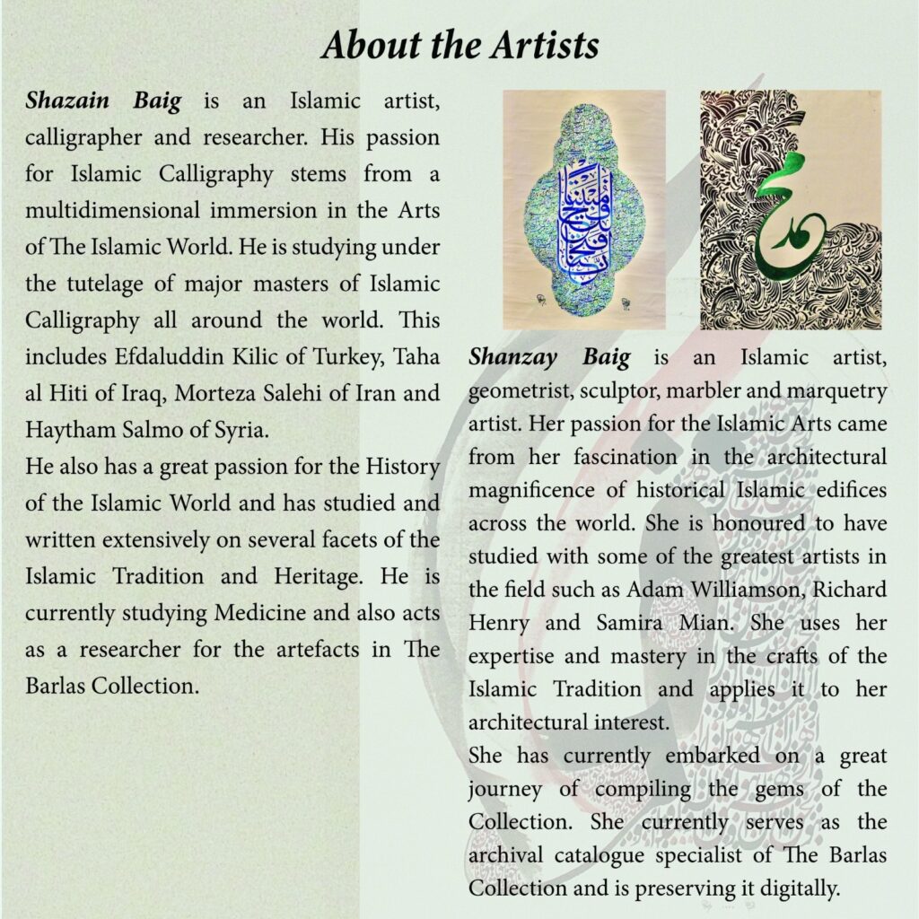 The artists, part of the renowned Baig family, have exhibited their work internationally and are recognized for their contributions to Pakistani art. Razwan Baig is known for his contemporary Kufic script works, Shazian Baig is a talented calligrapher and geometrical design artist. Shanzay Baig showcases her ornamentation and geometrical skills.