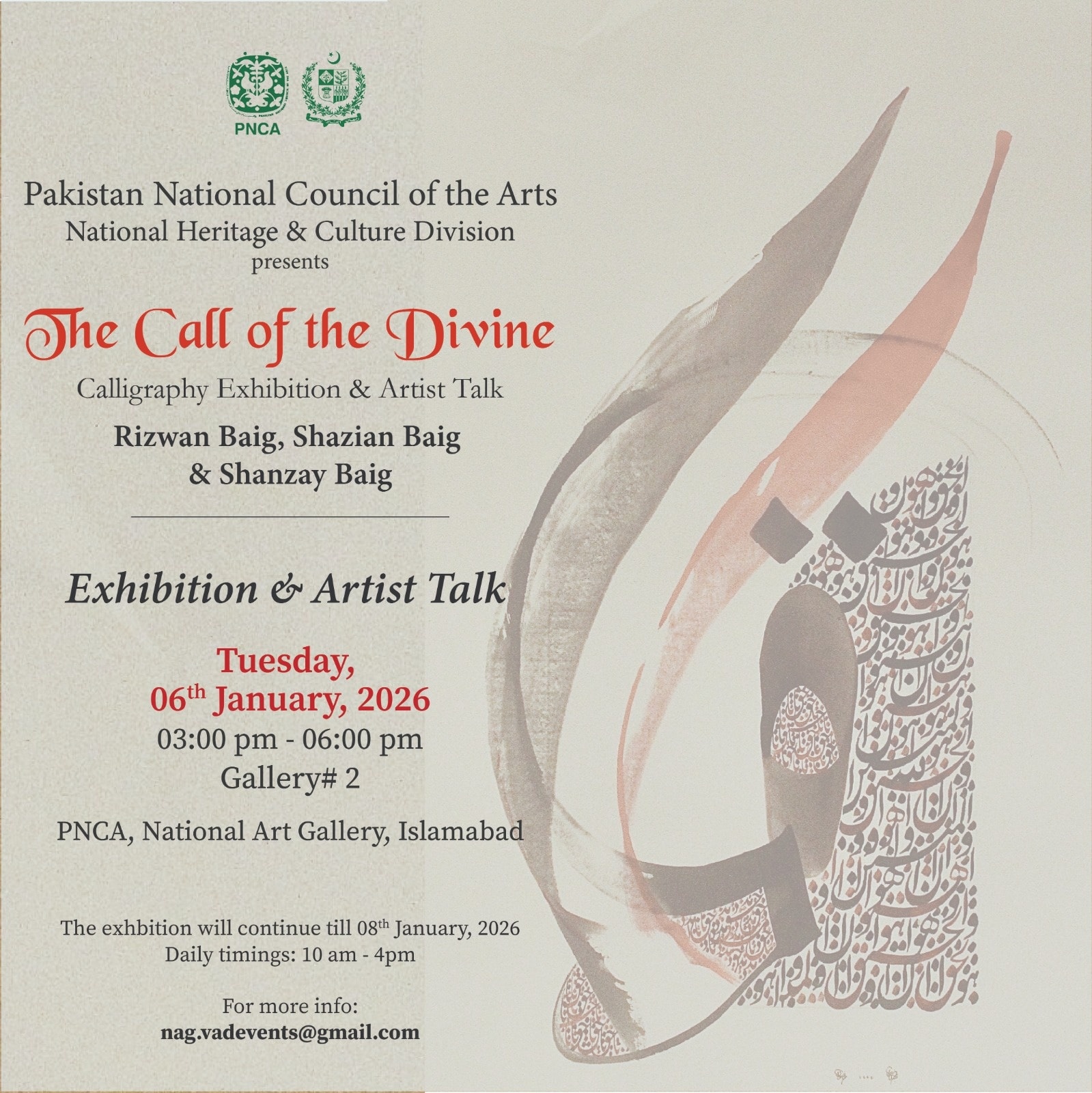 PNCA, National Art Gallery is hosting “The Call of the Divine,” a Calligraphic Exhibition and Artist Talk featuring Razwan Baig, Shazian Baig, and Shanzay. The exhibition showcases a blend of traditional and modern calligraphy, highlighting Quranic verses and Pakistani culture.