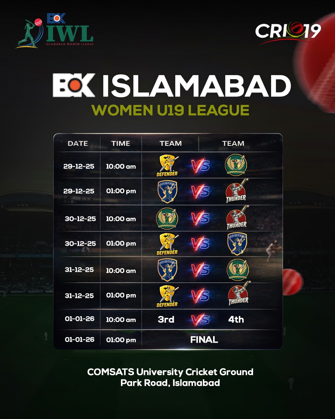 Organized by CRIC19, this league features talented U19 women cricketers competing across multiple matches, leading up to the grand final. Join us to support women’s cricket, witness rising talent, and be part of an energetic sporting atmosphere in Islamabad.