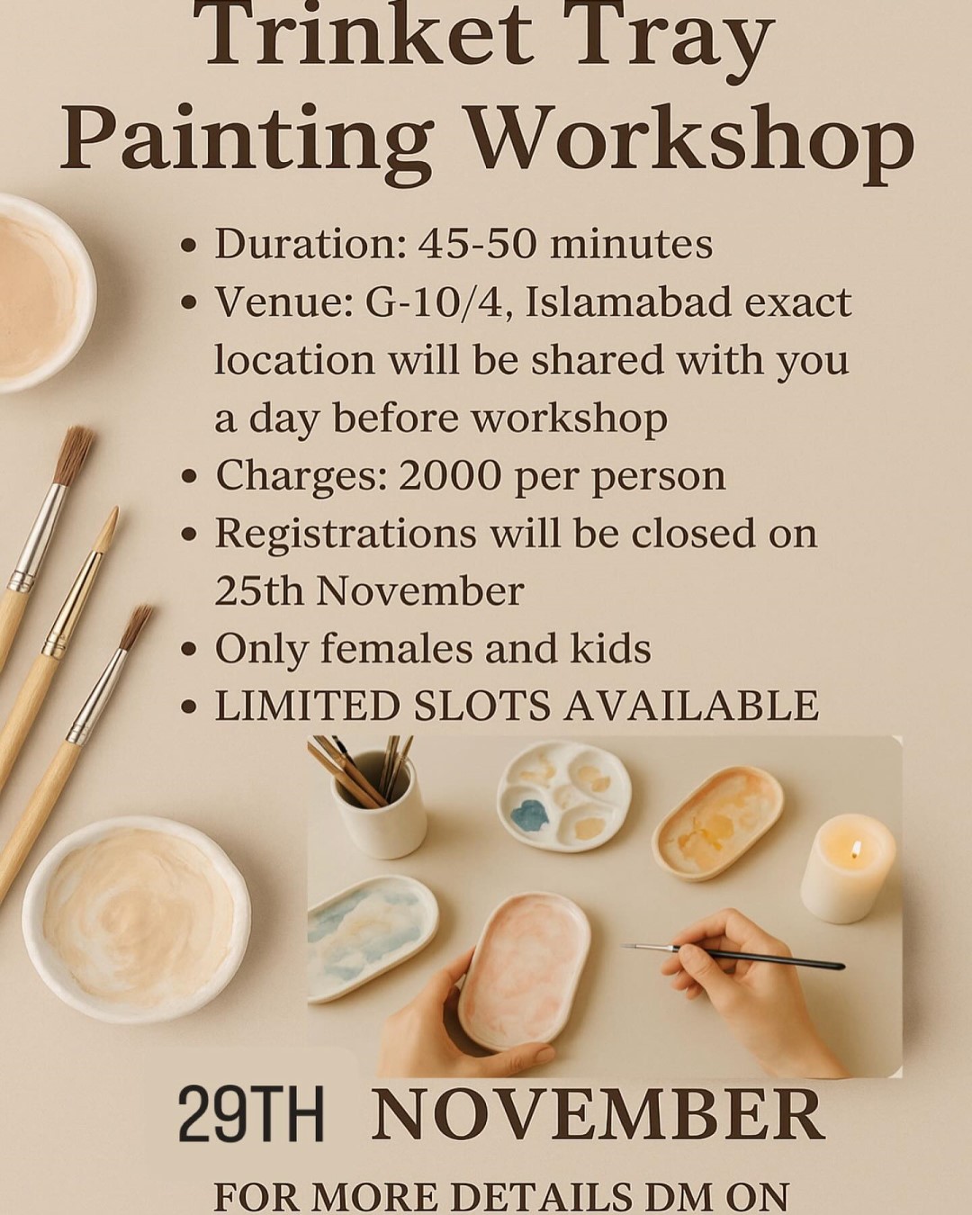 Calling all creative souls in Islamabad! Hazine Vermek is thrilled to host our first-ever Trinket Tray Painting Workshop in the city!