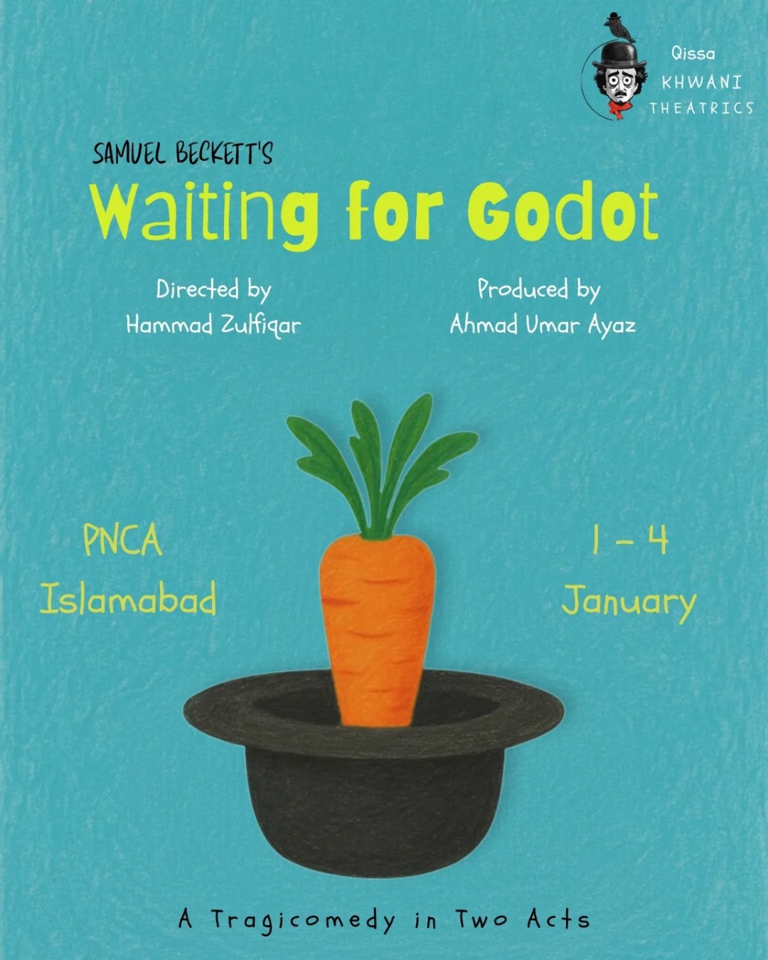 Qissa Khwani Theatrics presents Waiting for Godot, the defining play of modern theatre. In this Urdu translation, Beckett’s crisp humour and understated absurdity take centre stage, revealing a smart, surprising comedy about friendship, uncertainty, and the joy of waiting.
