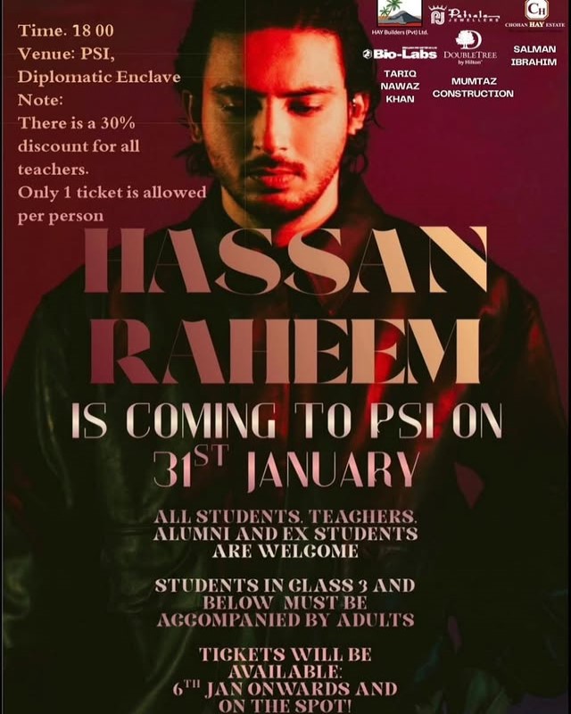 Hassan Raheem Concert Date(s): Saturday January 31, 2026 Timing: 06:00 PM – Onward Location: Preparatory School Islamabad (PSI), Diplomatic Enclave, […]
