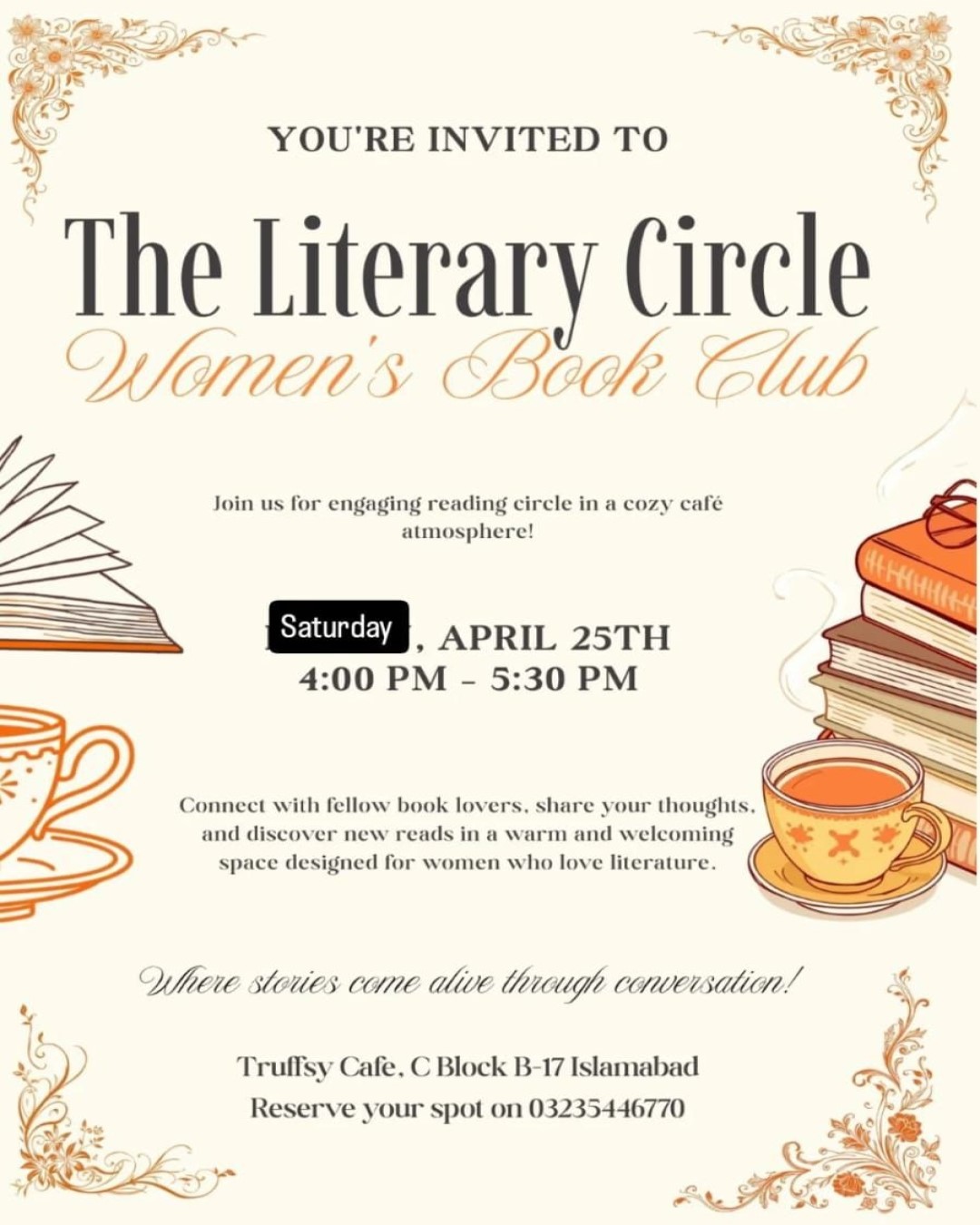 The Literary Circle - Women's Book Club   Date(s): Saturday April 25, 2026   Timing: 04:00 PM – 05:30 PM   Location: Truffsy, Block B-1 Markaz Multi Gardens, B-17, Islamabad  Ticket / […]