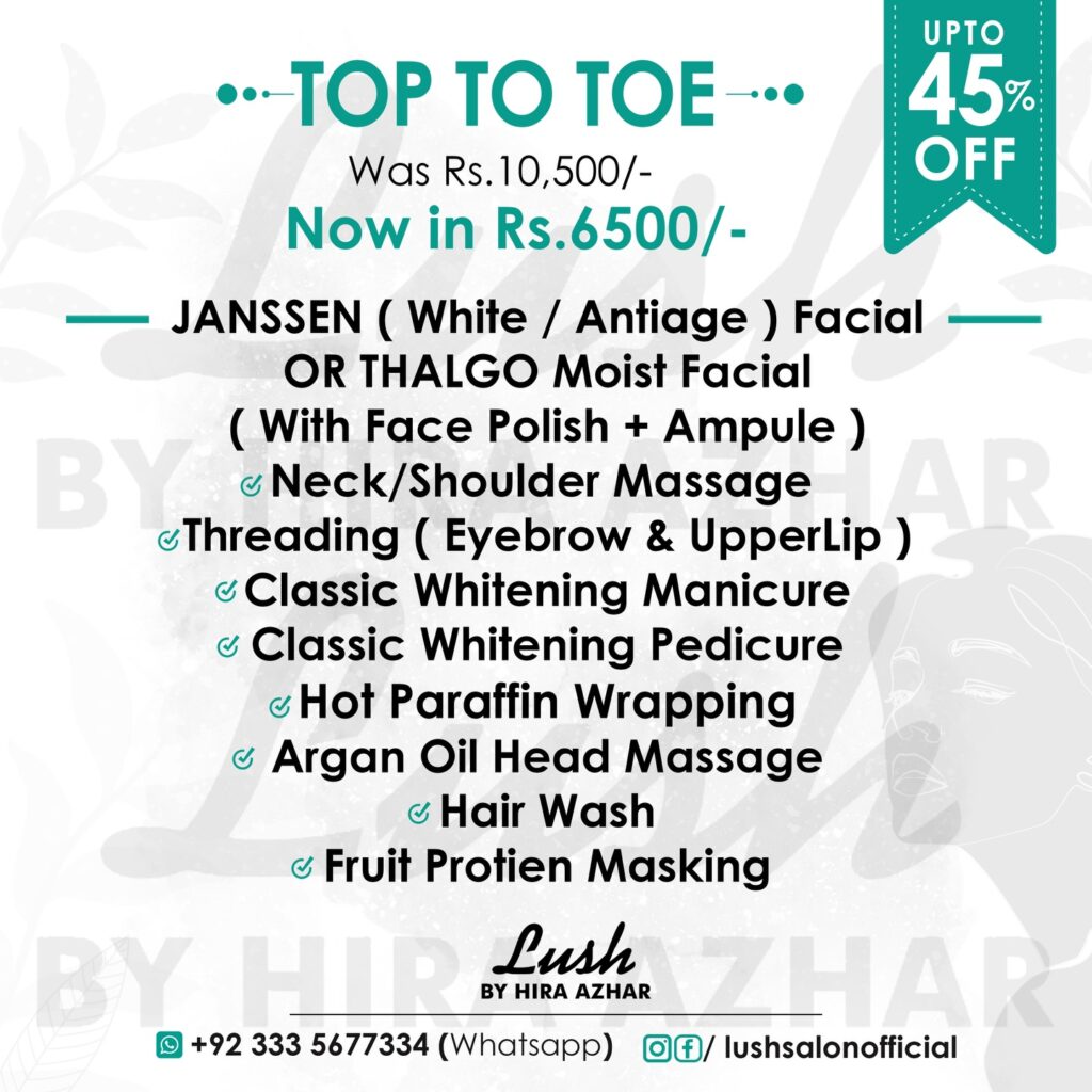 Top to ToeBy ADMIN / April 10, 2026 Spread the love Deals Available at All Branches of Lush. ➖ Satellite Town Commercial Market 051-4850544➖ Bahria Civic Centre 051-5731690➖ Main PWD Road 051-5421085 Views: 3 Spread the love